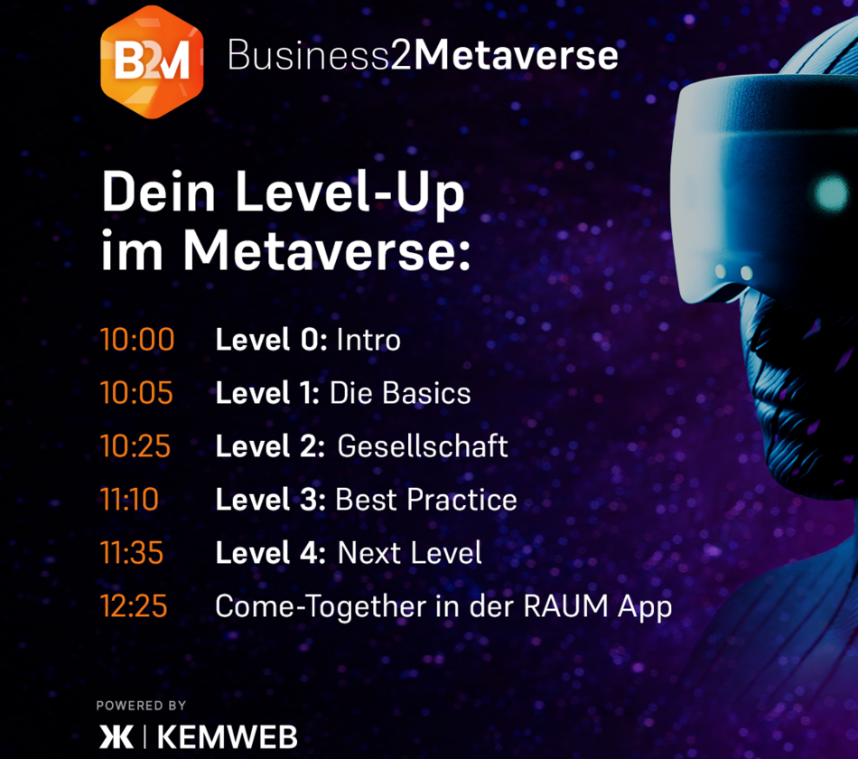 Hol dir die Antworten und finde heraus, welche Möglichkeiten das Metaverse schon heute für dich und dein Unternehmen bereithält: bei der diesjährigen Zukunftskonferenz Business to Metaverse von KEMWEB! In rund 2,5 Stunden erwartet dich ein spannendes Live-Event mit Impulsen, Tech-Demos, interaktiven Diskussionen und Roundtable-Sessions unserer vielfältigen Expert:innen. Das Event wird in Deutsch und teilweise in Englisch abgehalten.